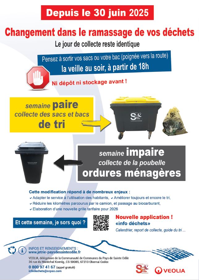 A partir du 30 juin 2025, la Communauté de Communes modifie la fréquence de ramassage des déchets. Pour l’ensemble des habitants, la collecte des ordures ménagères est réalisée semaine impaire et celle des emballages recyclables semaine paire.