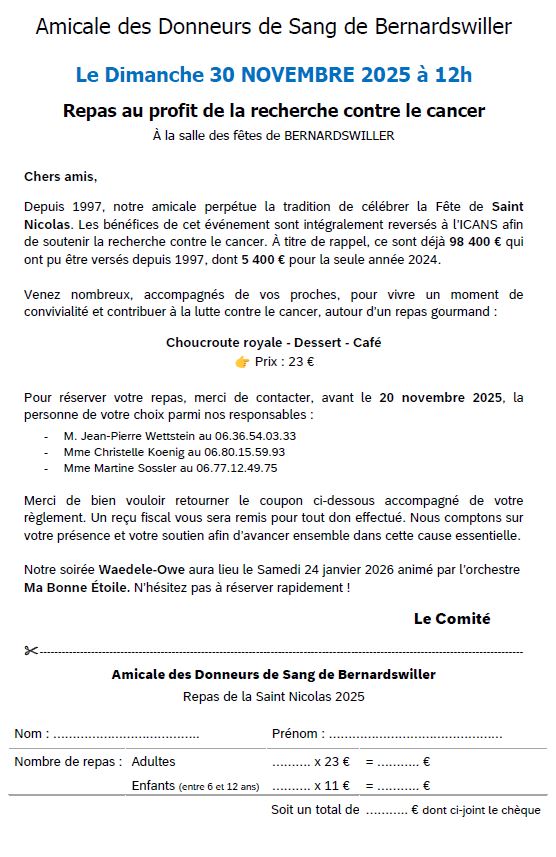Repas de la St-Nicolas au profit de la recherche contre le cancer